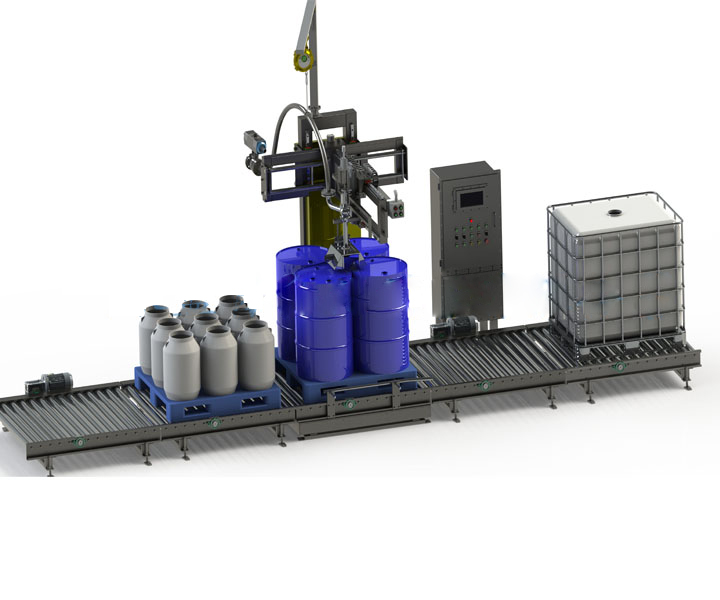 GZM-1000AUTO fully automatic machine for weighing and line filling of canisters, pails, drums and IBC on pallets. The robotic filler model is designed for high production and is highly automated. It also allows great flexibility in changing container types. It is suitable for filling canisters, pails, drums and IBC directly on pallets (containers from 20 liters to 1.500 liters).
